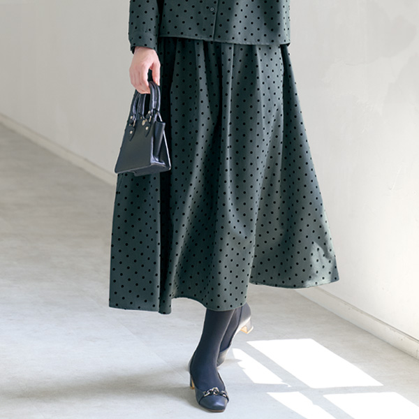 ドット柄のフロッキープリントが可愛らしい雰囲気。 ベーシックデザインは着回しやすく、ロングシーズン着用できる大活躍アイテムです。 別売りの同素材のスカートとのセットアップがおすすめです。