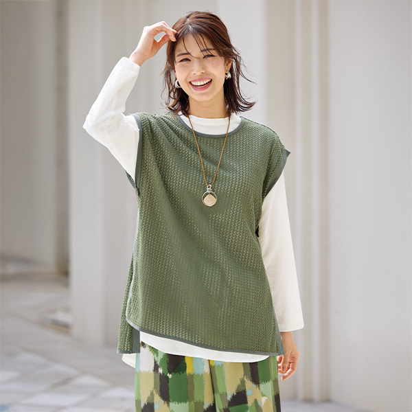 シワ感のある合繊生地のブラウス。 裾ラインが弧を描くロング丈ブラウスにゆったり涼しげな総レースベストを重ねたレイヤードスタイルのおしゃれを楽しんで シワ感のある合繊生地のブラウス。 おしゃれに体型をカバーしてくれる長めのラウンド裾がポイントです