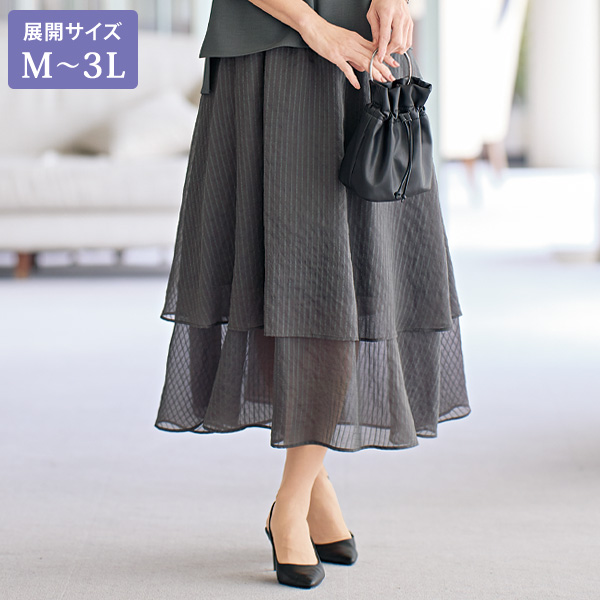 透け感に涼を感じる 気品を高めるシアー袖ブラウス 身頃はサラッとした合繊生地、袖はシアーストライプ生地にタックを寄せてふんわりさせたエレガントな一枚。 別売りの袖部分と同素材のスカートとのセットアップがおすすめです。