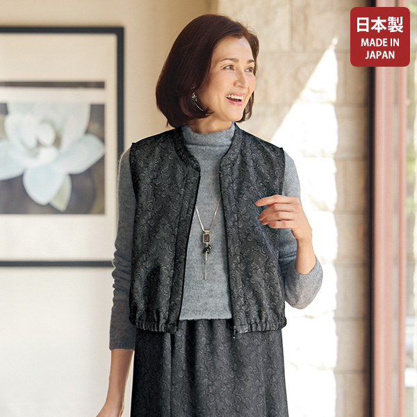 気品が香る更紗柄が凛とした姿を叶えて。 アムンゼン生地のドレープ性を生かしたきれいに広がるAラインのスカート。 ウエストゴムではきごこちのラクさも考慮しました。 ベストとのセットアップ風の装いでエレガントさを宿した都会的な着こなしを楽しんで。 □日本製