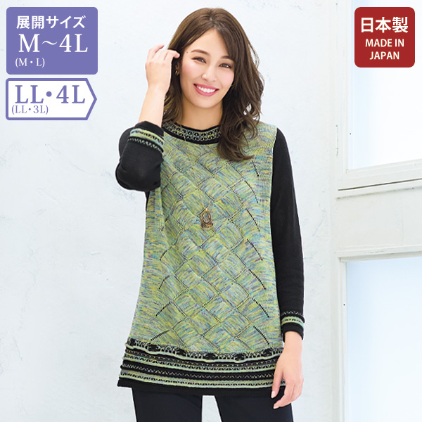 かすり糸の可憐さを黒で引き締めたモダンな配色 かすり糸のニュアンスある色合いが上品。 襟元や裾で編み地変化をして表情豊かな一枚に。 □日本製