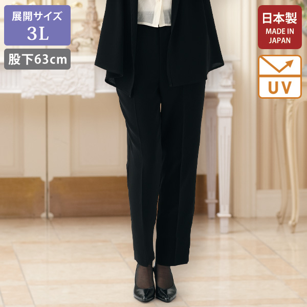 特別な日にも、普通の日にも 着映え力のある美ブラック。 黒の美しさが際立つ、凛とした印象。 特黒染料による深みのある「黒」 ブラックフォーマル生地で定評のある「テイジン ミルパ(R)」を使用。 濃染加工を施しているため、深みのある美しい染色が楽しめます。 ●深めの股上で座っても背中が出にくい ●ウエスト総ゴム仕様でラク ●ウエストゴム取替口付 □日本製 □UVカット □洗濯機で洗えます